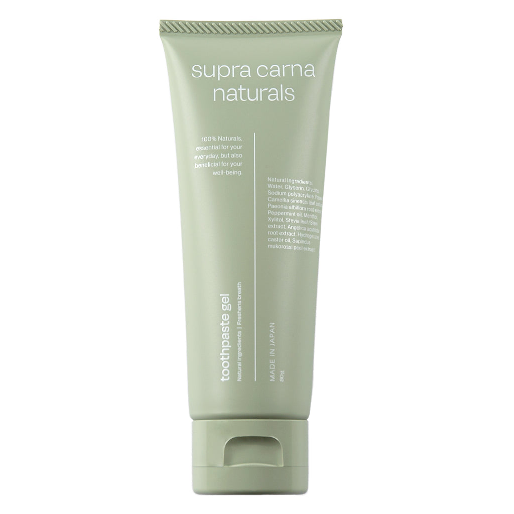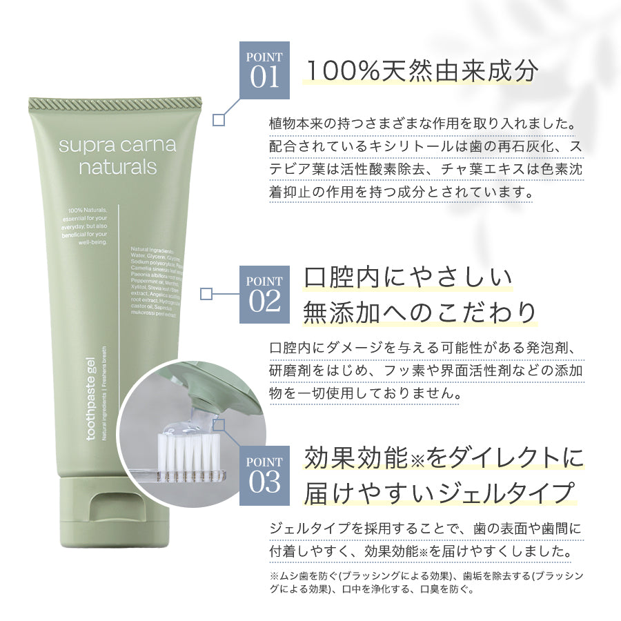 スプラ・カルナ・ナチュラルズ・トゥースペースト・ジェルの特徴はジェルタイプの歯磨き粉です。一般的なペースト状の歯磨き粉ではなく、ジェルタイプなので歯の表面や歯間に付着しやすく、効果効能※が届きやすいという特徴があります。